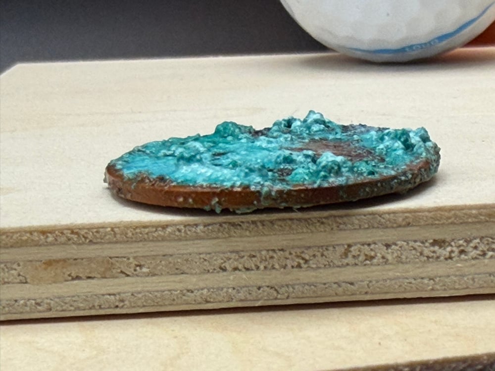 Solid copper ball marker with extreme patina. After formation of patina the marker is sealed in a clear coat to halt color or texture changes.